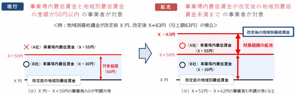 従来の助成対象は、事業場内最低賃金が地域別最低賃金プラス50円以内の事業所でしたが、現在、改定後の地域別最低賃金以下の事業所はすべて対象となります。最低賃金が63円アップした場合、事業場内最低賃金が、「従来の地域別最低賃金のプラス50円以上63円未満の事業所」が新たに助成対象となります。