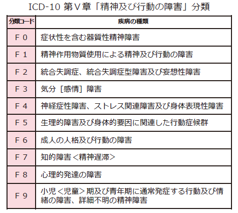 1つ目の要件の「認定基準の対象となる精神障害」とは、国際疾病分類第10版(ICD-10)に定められた精神障害で、うつ病や統合失調症などが該当します。